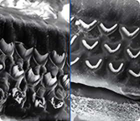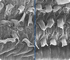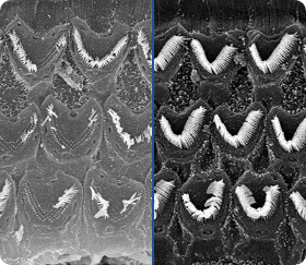 Haarzellen bei Hörstörungen und nach der Hörverbesserung. / Bewegen Sie den Schieberegler, um den Unterschied zu sehen.